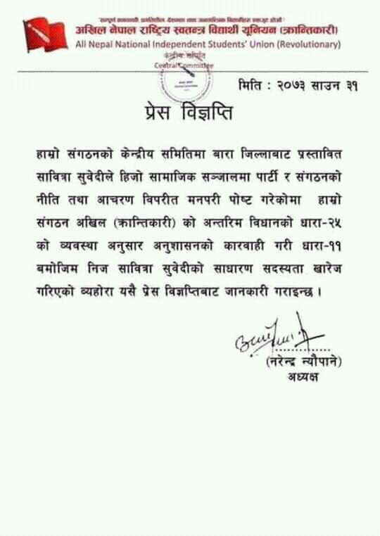 सामाजिक सञ्जाल फेसबुकमा पार्टी अध्यक्षसमेत रहेका प्रधानमन्त्री पुष्पकमल दाहाल ‘प्रचण्ड’ र राज्यमन्त्रीमा नियुक्त भएकाहरुबारे अपशब्द प्रयोग गरेर स्टाटस लेखेको आरोपमा संगठनले प्रस्तावित केन्द्रीय सदस्य सावित्री सुवेदीमाथि कारबाही गरेको हो ।