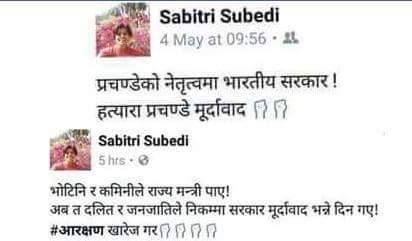 सुवेदीले आफ्नो स्टाटसमा प्रचण्डको नाम ‘प्रचण्डे’ लेखेकी छन् । प्रचण्डको नेतृत्वमा भारतीय सरकार बनेको उनको पोष्टमा छ । ‘प्रचण्डेको नेतृत्वमा भारतीय सरकार, हत्यारा प्रचण्डे मूर्दावाद !’ उनले लेखेकी छन् ।